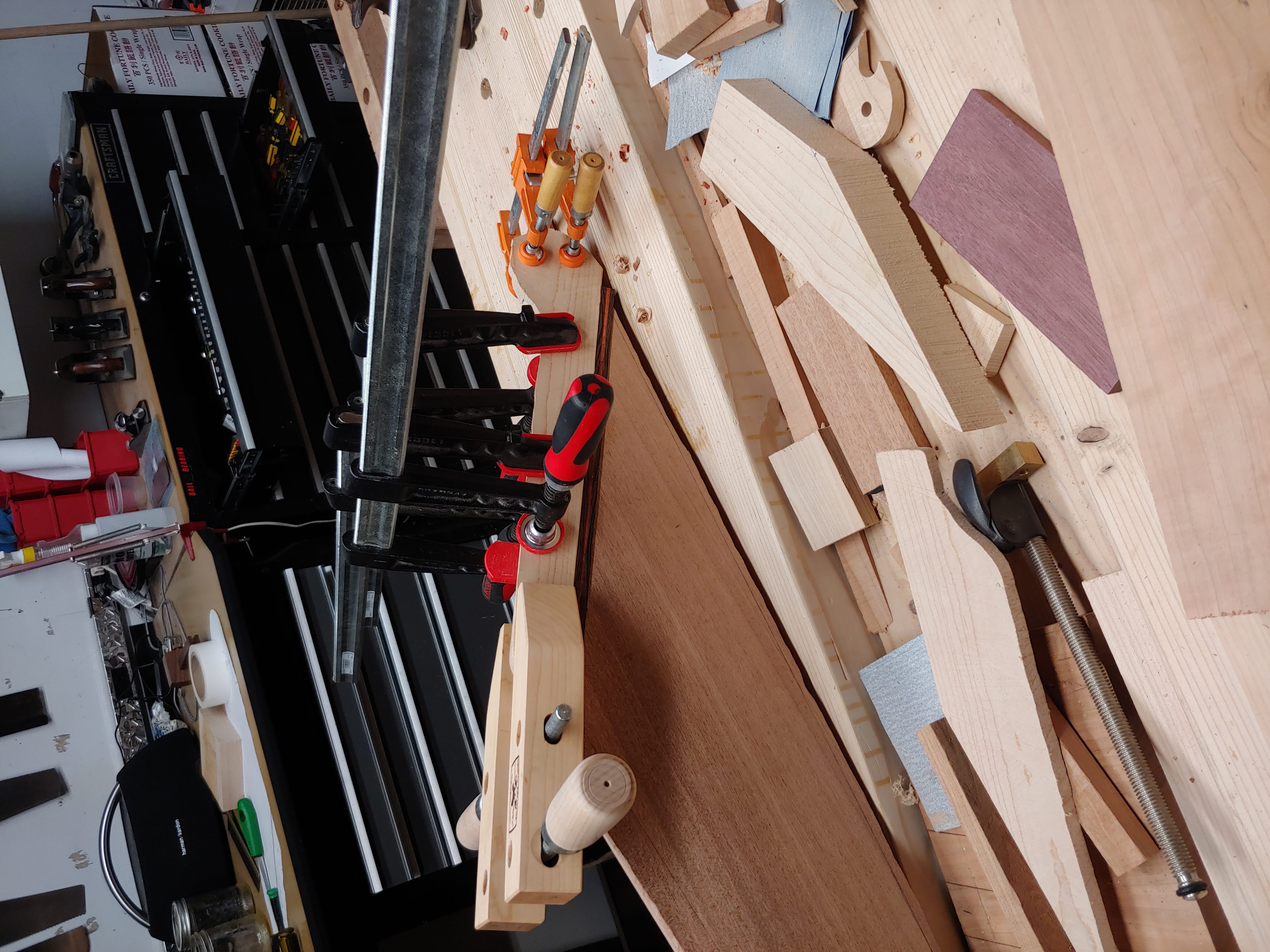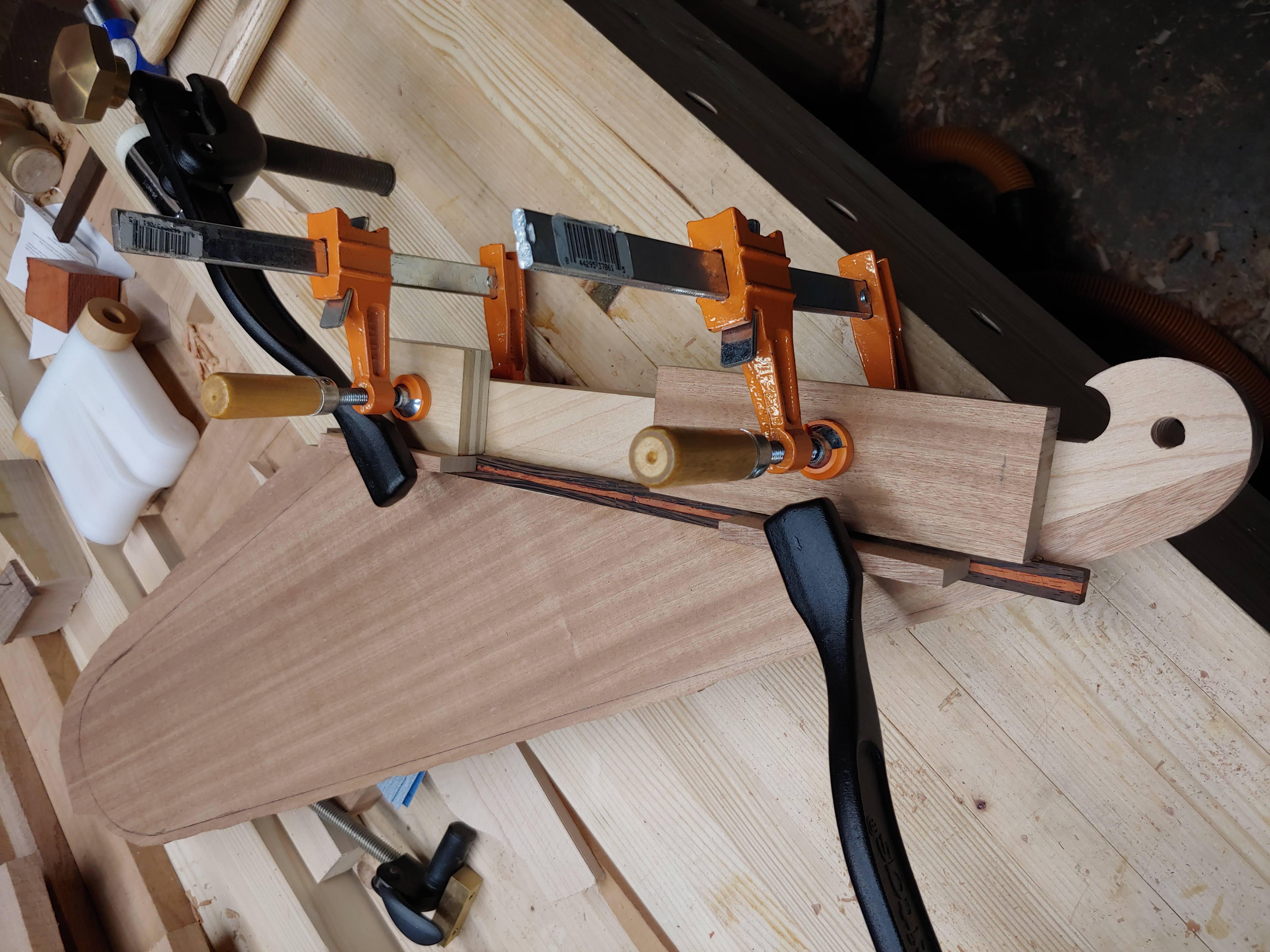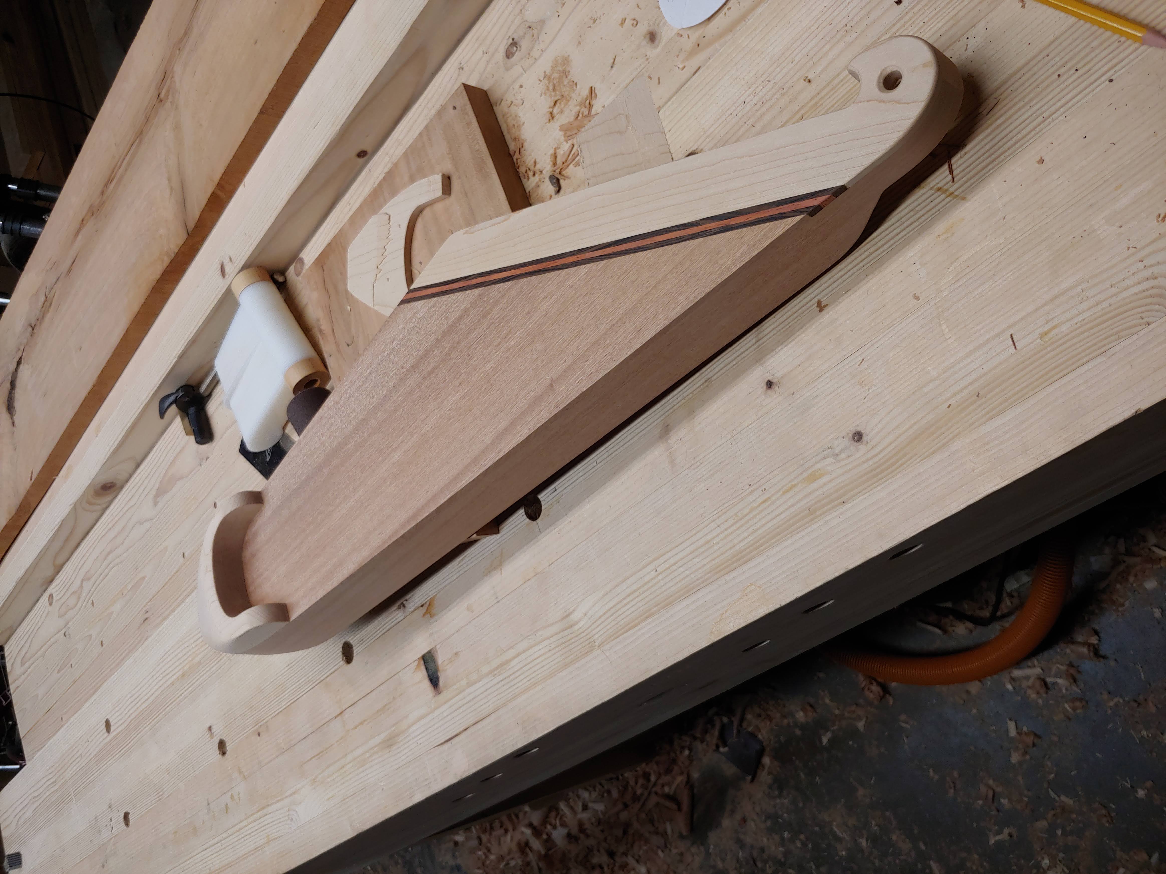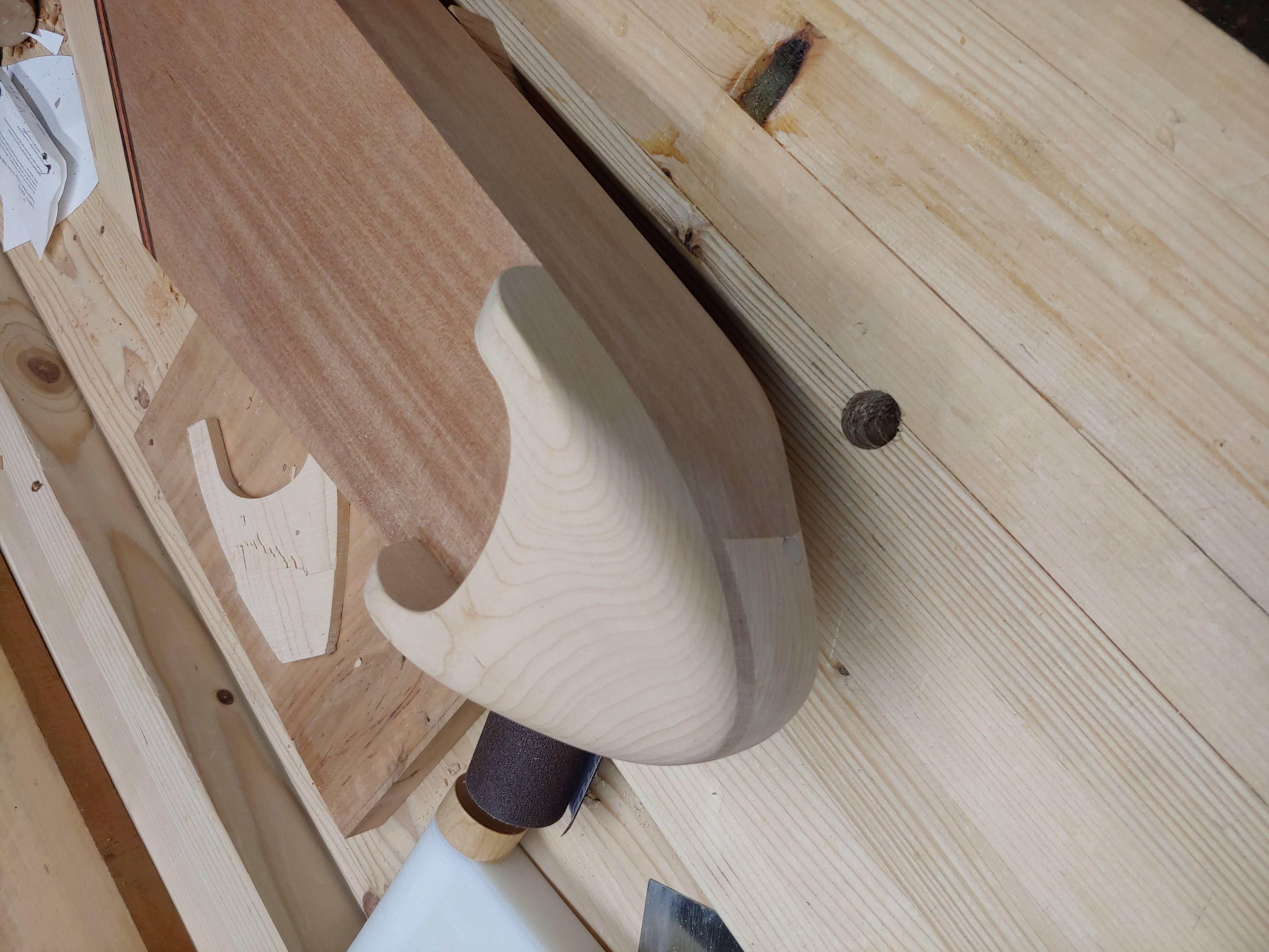 When gluing the frame, I inserted a few dowels between the maple and the sapele sides to stop movement during gluing. I added an additional piece of sapele on the bottom of the maple head to complete the frame, and then did shaping using chisels, gouges, rasps and files to finish off the shape of the frame.
