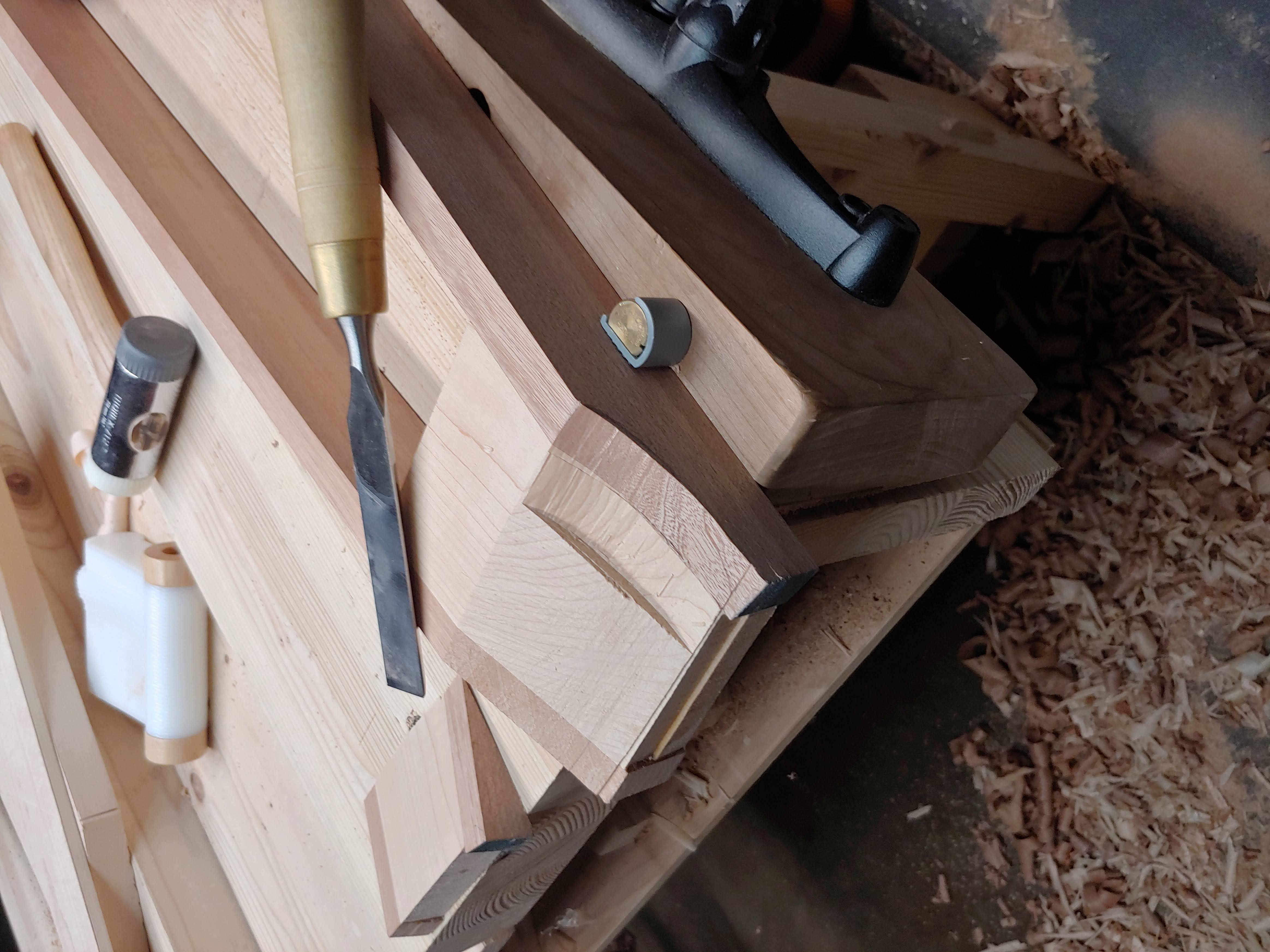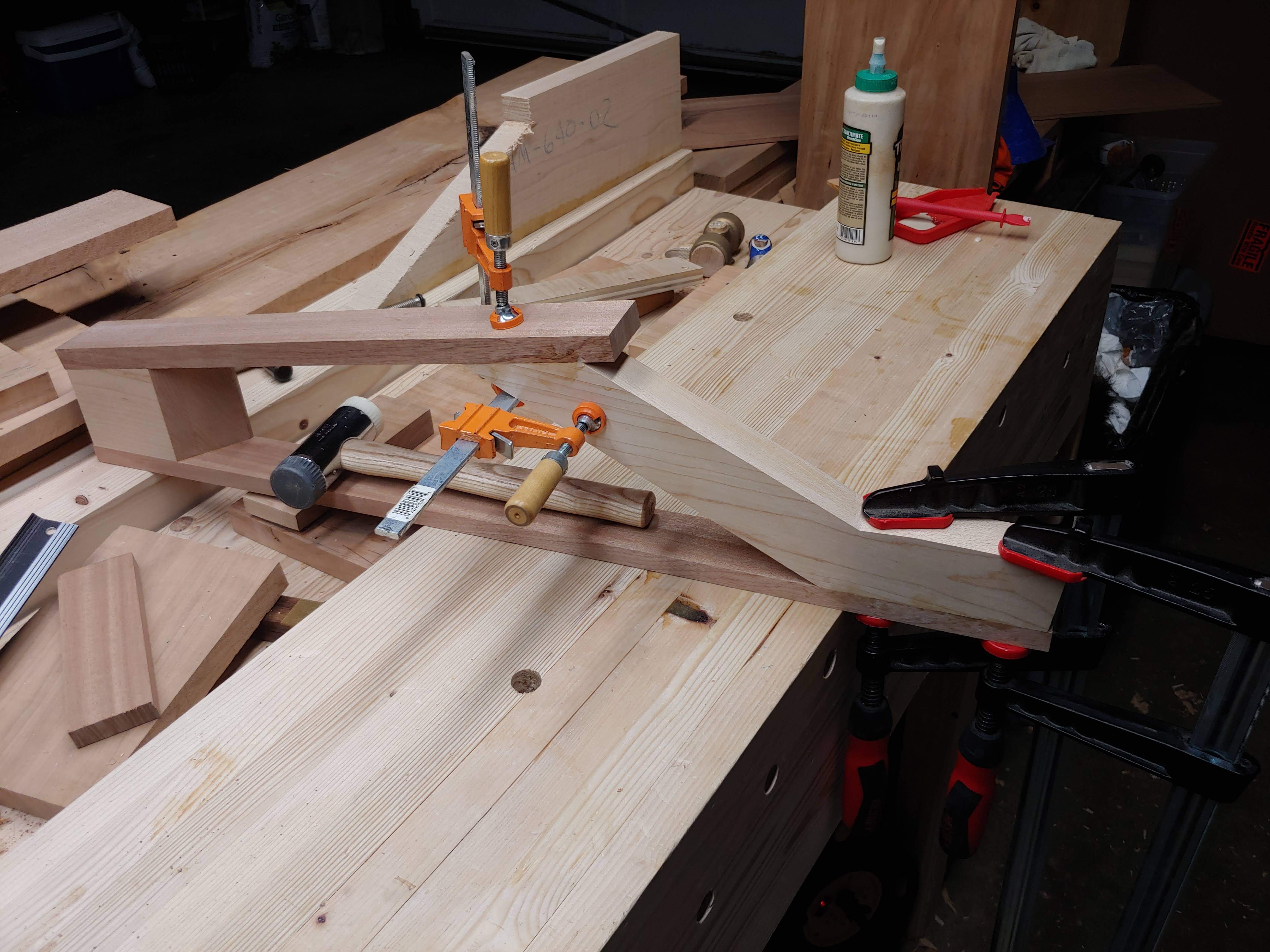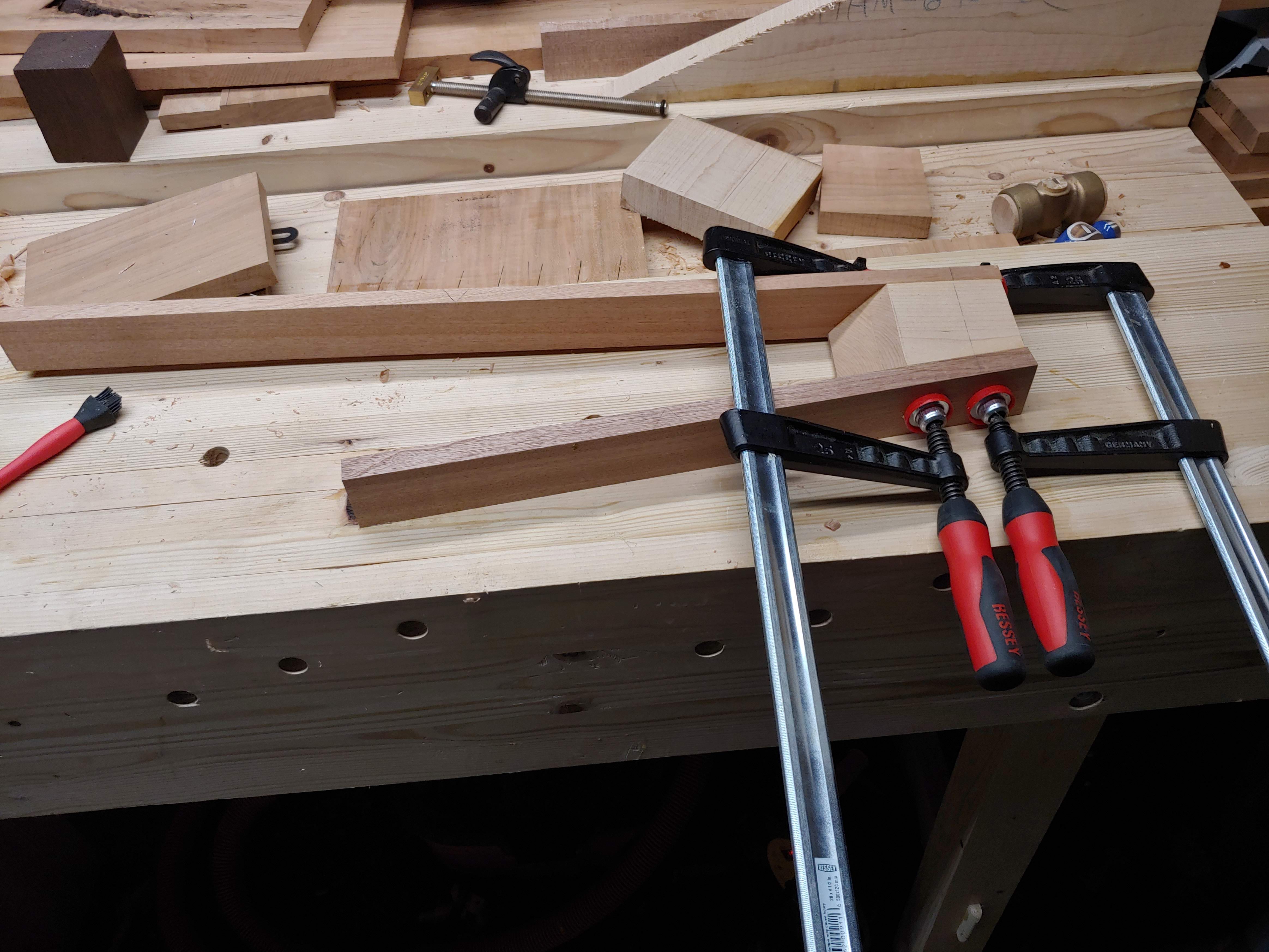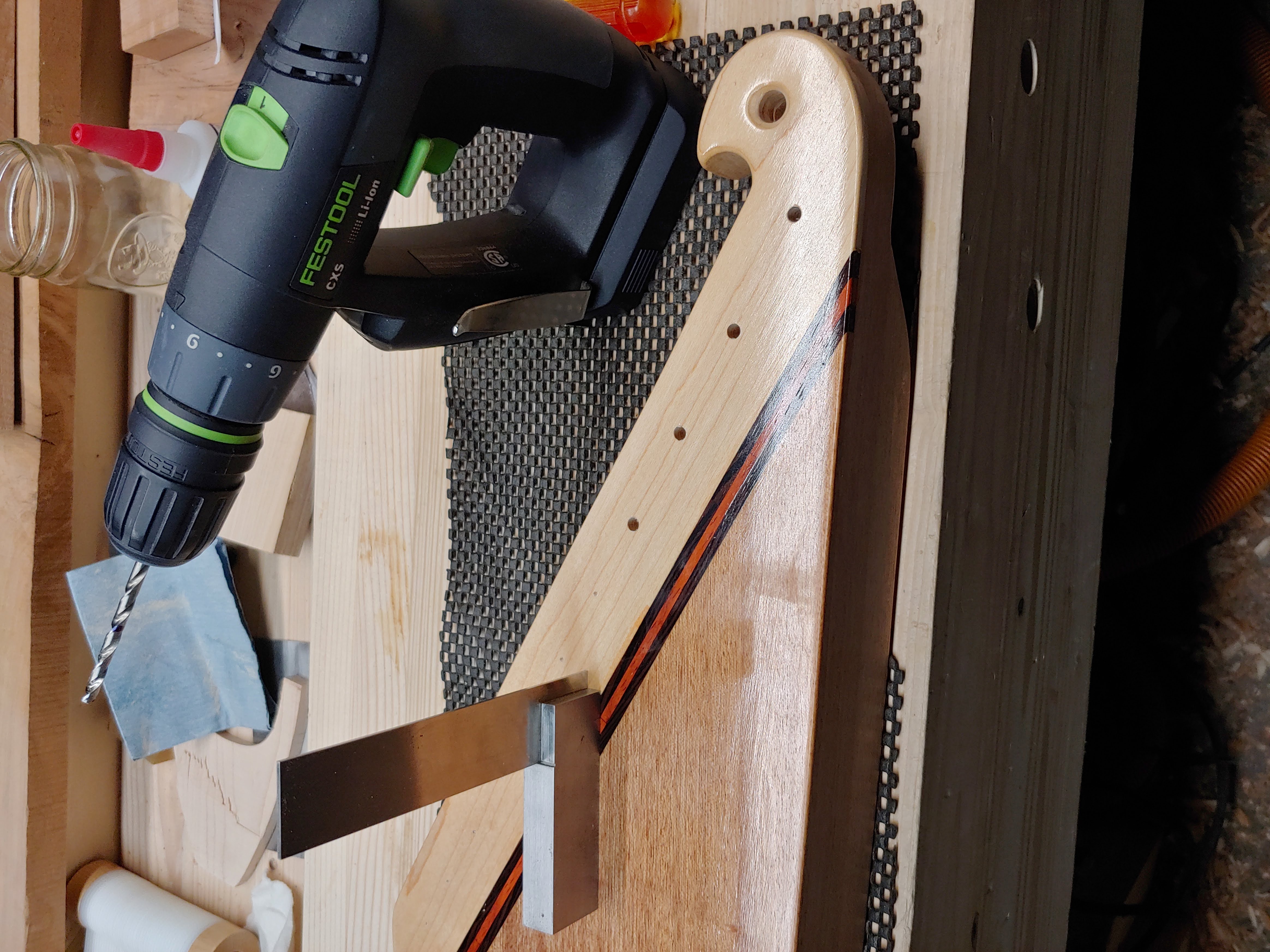 When gluing the frame, I inserted a few dowels between the maple and the sapele sides to stop movement during gluing. I added an additional piece of sapele on the bottom of the maple head to complete the frame, and then did shaping using chisels, gouges, rasps and files to finish off the shape of the frame.