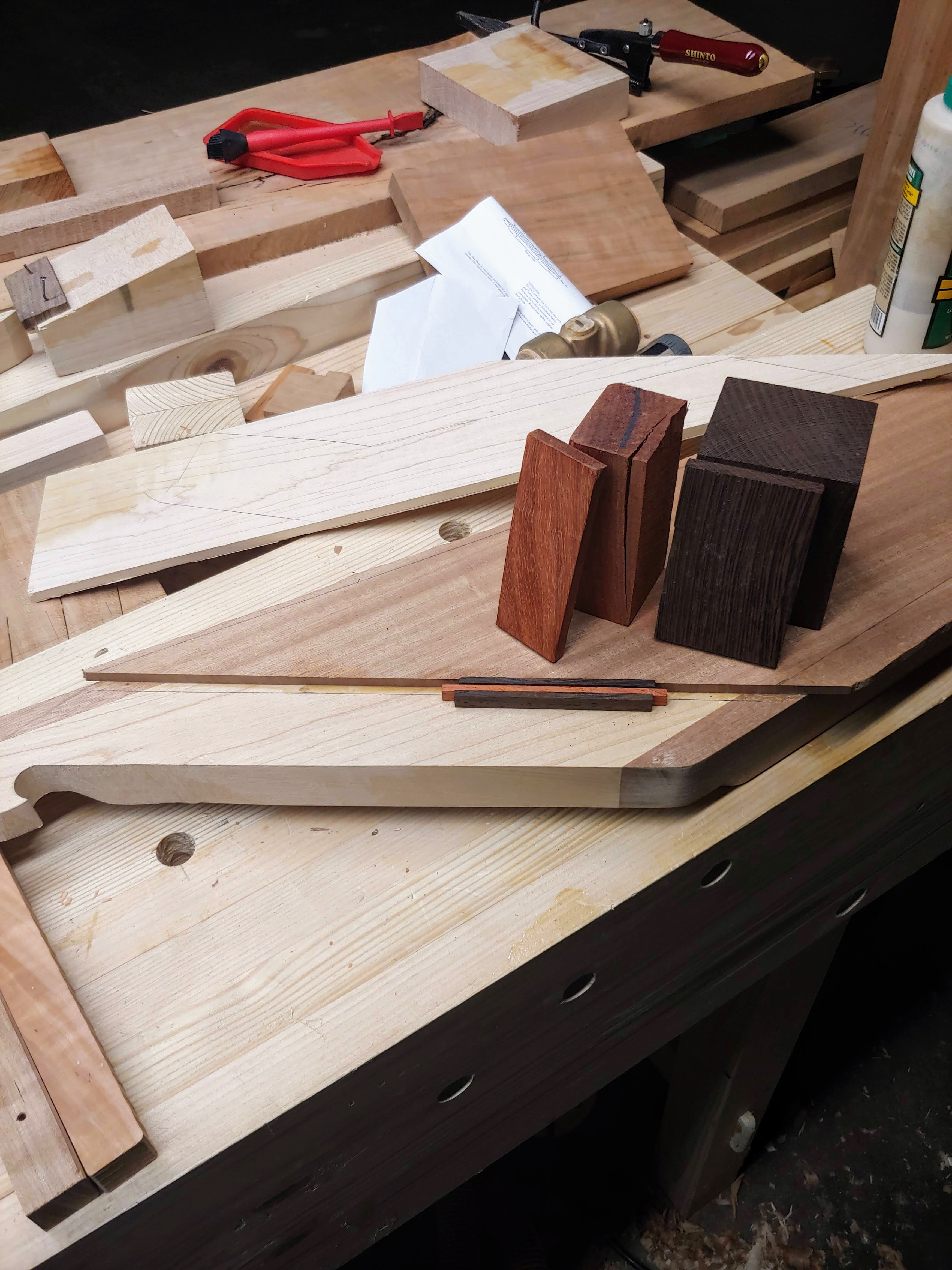 I wanted to add some accent between the soundboard and the maple head, so I made some strips of wood from bloodwood and wenge. The red and dark colors complement the otherwise fairly light instrument very nicely.