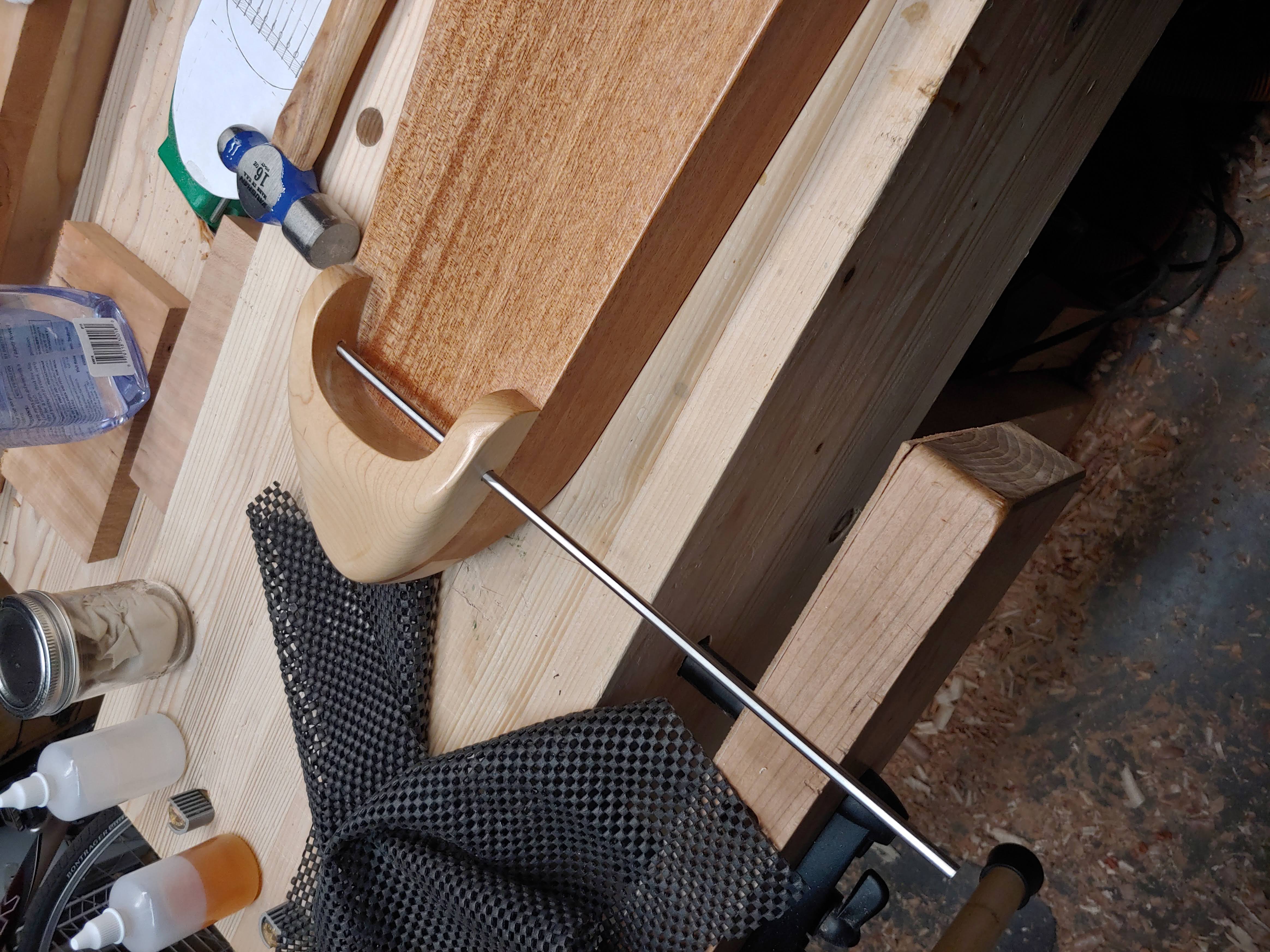 With the frame and the soundboard complete, it only remained to add the main stock that holds the steel bar for the strings to attach. I spent a lot of time shaping the stock, since that’s where the player’s right hand rests most of the time.