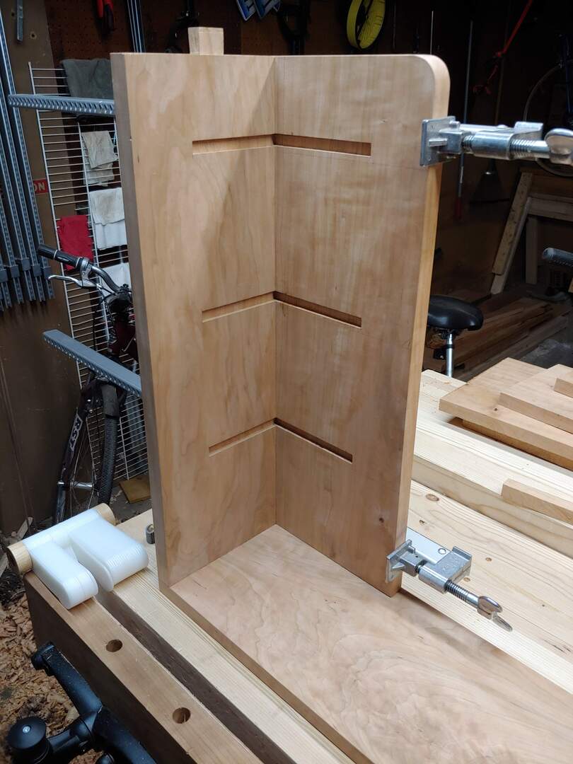 At the left, I attached a side board using dovetails to the bottom shelf, and then using a rabbet in the side board attached a back panel for the smaller shelves. The back is also attached to the bottom using a dowel, but that’s only near the left edge to allow for wood movement.