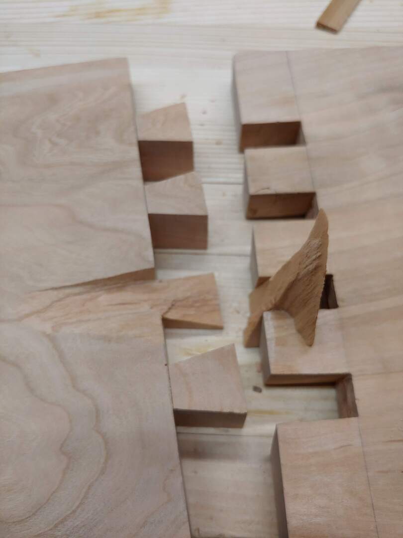 I added little pegs to the perimiter of the small shelves to make sure cats couldn’t knock the boxes out of the shelves. The pegs I made from a long dowel of walnut